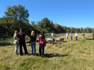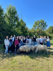 Nach einer Mittagspause in der Septembersonne kam dann das Highlight des diesjährigen Seminars – die Gruppe durfte eine Schafherde besuchen. Und nicht nur das: Es gab eine Aufgabe zu lösen, nämlich die 12 Schafe in den Stall zu führen. Was sich zunächst leicht anhört, wurde aber erst akribisch geplant. Aufgaben wurden verteilt, wie etwa „Streckenposten“, Anführer, Treiber, … . Zudem haben wir darüber nachgedacht, was passieren KÖNNTE. Alles Dinge, die wir auch im Alltag brauchen, wenn wir zum Beispiel die Halloweenparty planen. Lustigerweise zeigten uns die Schafe auch, dass man zwar planen kann, aber dann doch wieder etwas anderes eintritt als erwartet. Die Herde entdeckte nämlich das frische Gras am Wegesrand und ließ sich nur schwer dazu bringen, in den Stall zu gehen. Alle Tutoren bewahrten aber Ruhe und bewiesen Geduld, sodass die Aufgabe letztendlich erfolgreich bewältigt wurde!