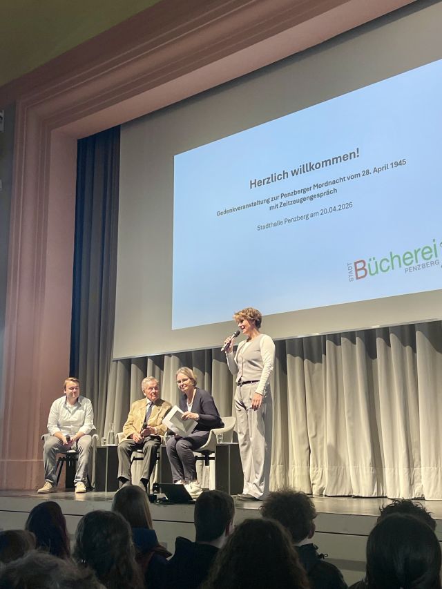 Im Rahmen unseres Geschichtsunterrichts durften acht Tage vor dem 81. Gedenktag der „Penzberger Mordnacht“ alle vier 9. Klassen am Montag, den 20. April 2026, in der Stadthalle Penzberg die durch die Stadtbücherei Penzberg organisierte und kostenfreie Veranstaltung „Stimme der Erinnerung: Die Penzberger Mordnacht durch die Augen eines Zeitzeugen“ besuchen.